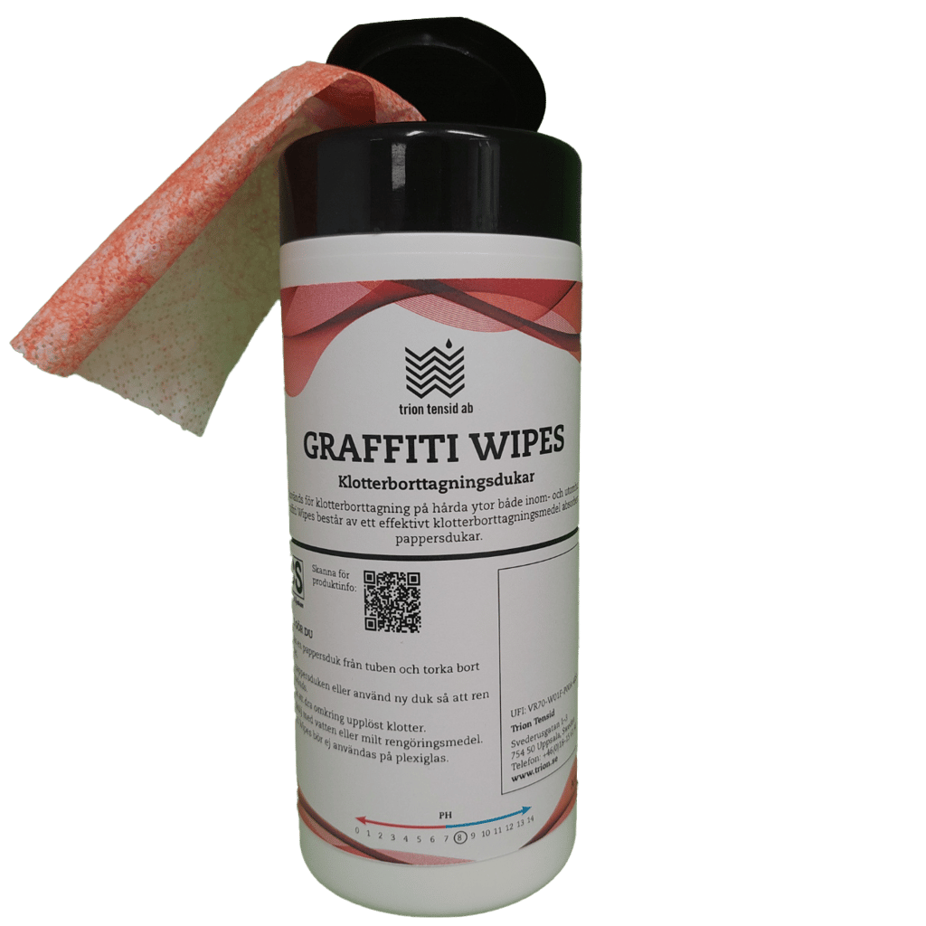 Graffitifjerning Wipes brukes til fjerning av graffiti. Brukes både inne og ute. Brukes på industrimalte overflater og visse andre ømtålige overflater.
