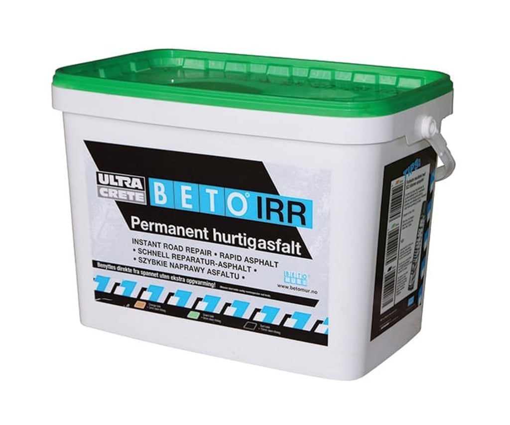 Beto IRR Asfalt er en permanent reparasjonsasfalt for alle typer hurtige reparasjoner av asfalt og mindre arbeidsoppgaver, godkjent for bruk i vei og trafikkarealer. 6 mm tilslag. Se tilhørende produkt forseglingspray, og setningsfri masse for tilbakefylling.