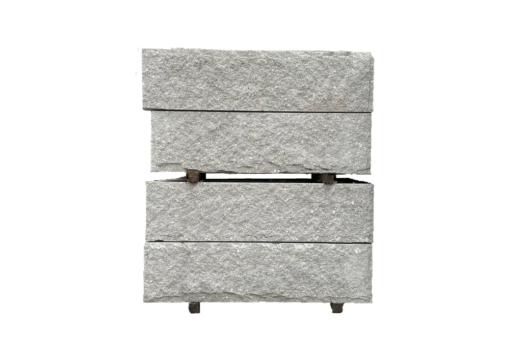 Granitt blokkene har råhugget front og bakside, med saget topp og bunn for enkel montering. Sidene er saget/hogd for gjevne og fine fuger. Dette gir deg en natursteinsmur som er enkel å montere og resultatet blir en tett og flott mur.