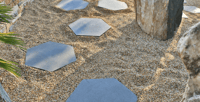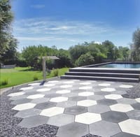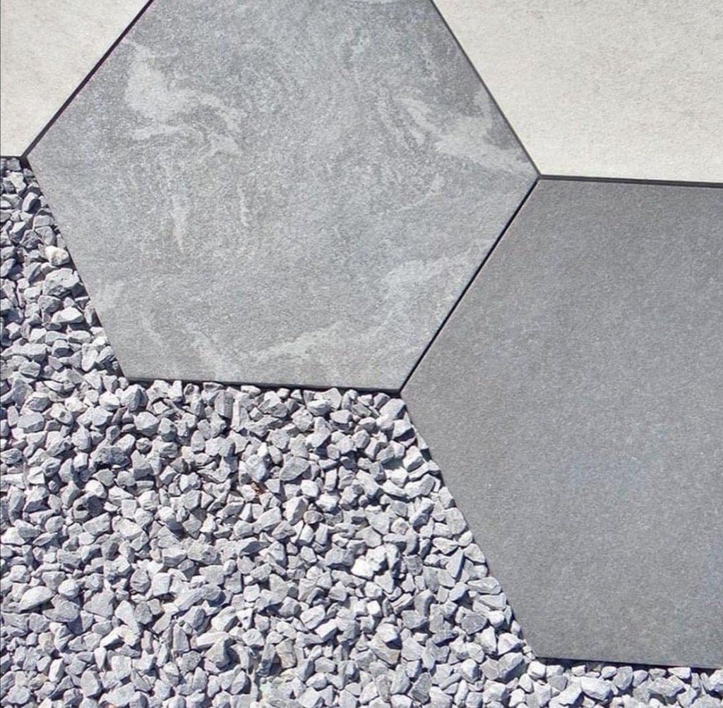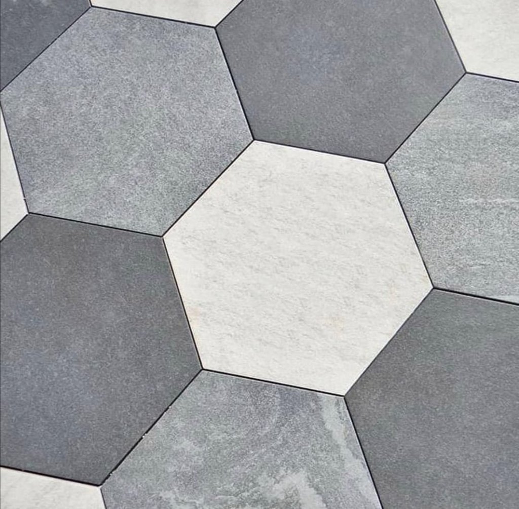 Heksagon Keramisk Helle Gråmix er 2cm tykke og kommer i fargene Gråmix, Latte og Basalt. Ø 60-52×2