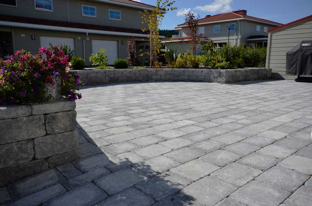 Herregård, tromlet betonghelle gråmix er kjøresterk, og velegnet for private gårdsplasser med personbiltrafikk. Herregård helle kan også brukes som topphelle på Herregård mur.