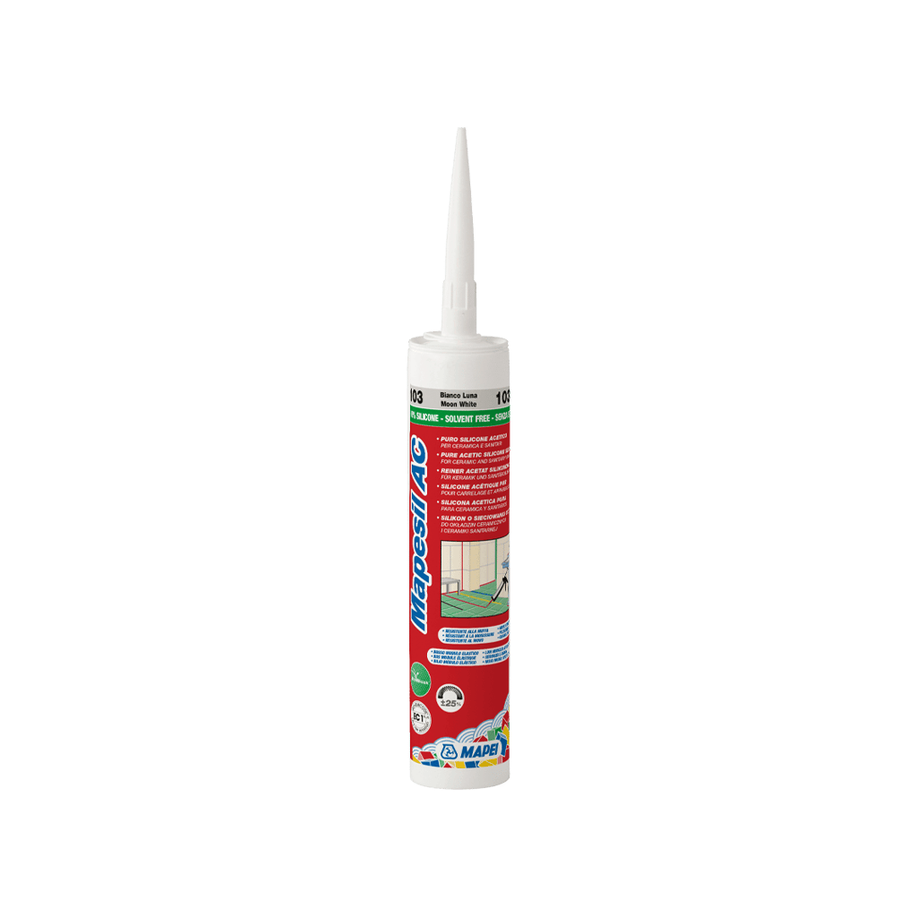 Mapesil AC 110. Ren acetatbasert, silikonfugemasse bestandig mot mugg med BioBlock® – teknologi. For bevegelser opp til 25 %.