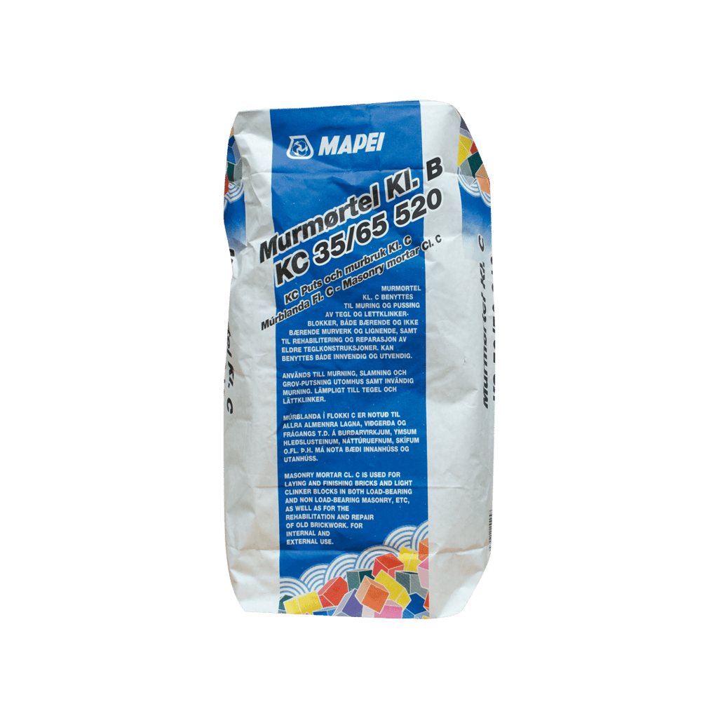 Murmørtel KC . Kalk-/sementmørtel for muring og pussing av tegl og lettklinkerblokker.