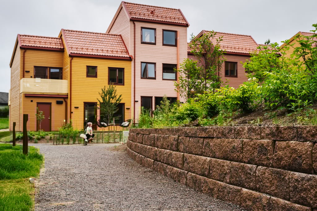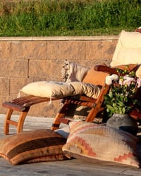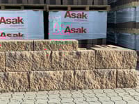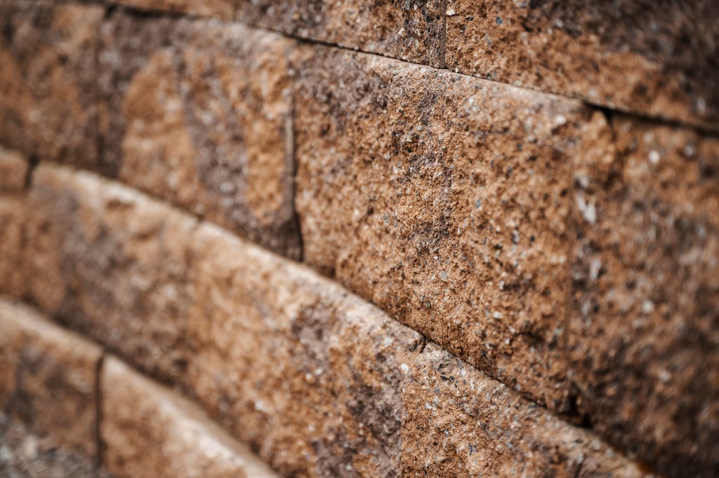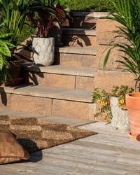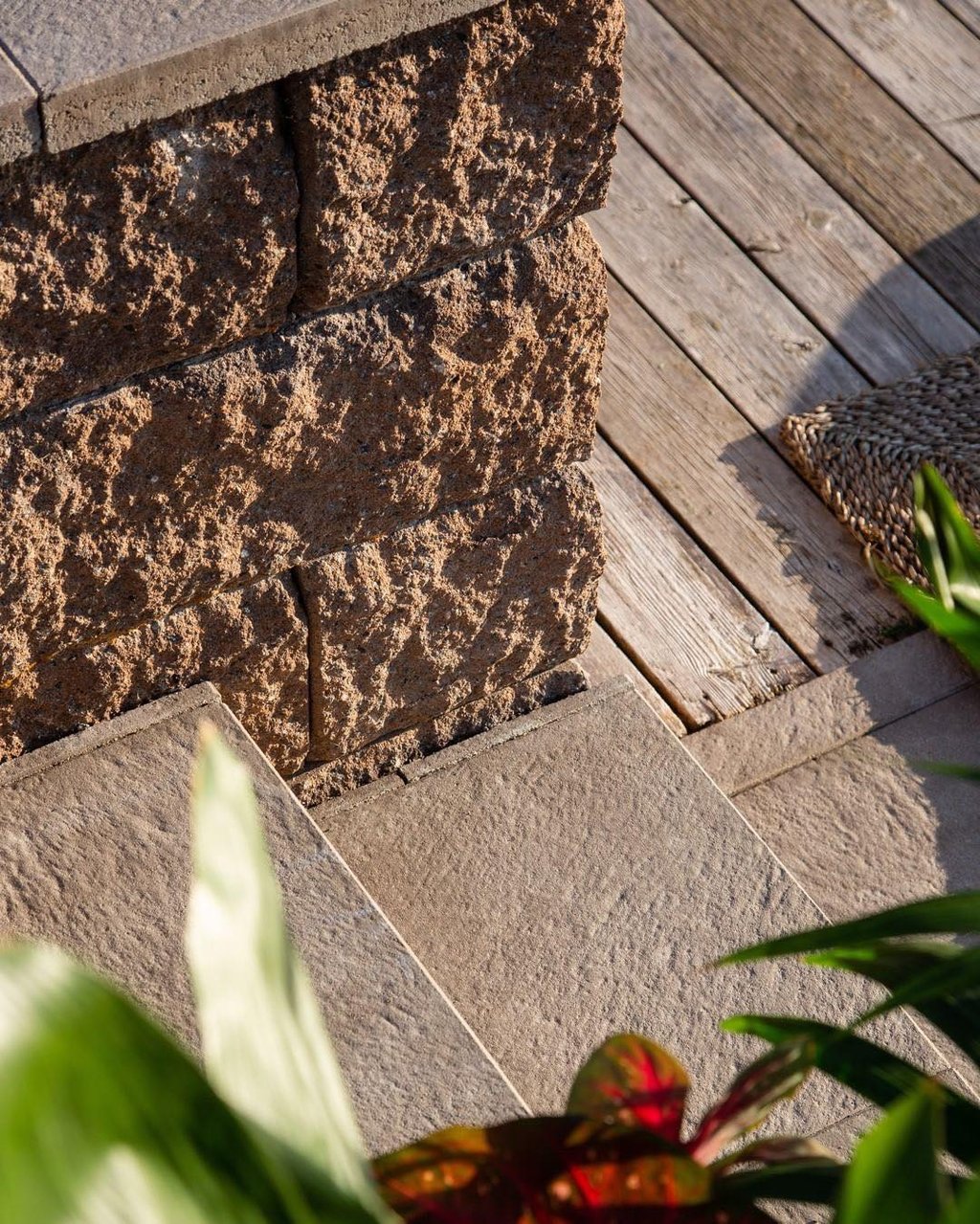 Vertica® mur er en stilren støttemur med store rektangulære blokker. Vertica Betongmur Hjørne Natur.